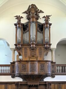 C’est au fond du chœur des moniales, situé au Nord archéologique, derrière une grille de clôture, que se dresse depuis 1737 l’orgue de Jean-Baptiste Le Picard (1706-1779), le plus important facteur d’orgues liégeois du XVIIIe siècle. L’instrument de l’abbaye bénédictine de Liège est le plus ancien orgue conservé de Le Picard. Il témoigne de la maîtrise absolue du jeune facteur qui n’en était certes pas à son coup d’essai. L’utilisation de sommiers à gravures alternées pour Grand-Orgue et Positif est caractéristique de ce type d’instrument à deux claviers et demi, dans un buffet unique de 4 pieds. En 1836, Dieudonné-Joseph Comblain (Blégny-Trembleur) entreprend de moderniser l’instrument. Certains jeux aigus disparaissent au profit de jeux plus graves et plus moelleux. Le diapason est haussé d’un demi-ton, le tempérament devient égal et la tessiture des claviers est élargie au moyen de sommiers additifs. En 1910, une deuxième campagne de travaux permet d’aller plus loin encore dans les transformations : François Joris (Renaix) place un Récit expressif complet. Deux jeux anciens sont réduits au silence, mais heureusement conservés (Fourniture et Cornet). En 1977, un cahier des charges de restauration à l’identique est dressé par Hubert Schoonbroodt, professeur d’orgue au Conservatoire royal de Liège. Après consultation, les travaux sont confiés à la Manufacture d’Orgues Luxembourgeoise, dirigée par Georg Westenfelder. Deux soufflets cunéiformes sont construits sur le modèle de ceux de Fraipont (milieu du XIXe siècle). Une pédale indépendante est ajoutée derrière le buffet ancien. Dans le Plein Jeu, ce sont surtout la Sesquialtera (principalisante) et les Fournitures et Cymbale – à reprises d’octave sur do3 – qui sont typiques. En 2002, l’orgue a subi un relevage complet. À cette occasion, le tempérament de Lambert Chaumont (1695), qui avait été choisi en 1980, a été remplacé par un tempérament Rameau. D’autres instruments de Jean-Baptiste Le Picard ont été restaurés à Beaufays (1742/1993), Elsaute (1747/1991) et Tongres (1753/2002).