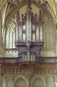 Les buffets datent de 1600 et 1602 (millésimes au centre du grand buffet et sous le positif de dos). L’auteur originel de l’orgue est inconnu, mais il pourrait s’agir de Florent Ier Hocquet ou de Bernard Spiering. Ce fut probablement un orgue à deux claviers sur base de 12 pieds. En 1669, l’orgue est complètement reconstruit par André Séverin, qui aura le privilège d’être inhumé sous son orgue (pierre tombale enchâssée dans le mur Ouest du massif occidental). En 1854, Arnold Clerinx reconstruit entièrement l’orgue (44 jeux, III-P). Le fond du grand buffet est supprimé et le Récit expressif placé à l’arrière. En 1888, l’instrument est à nouveau transformé par Charles Anneessens. Un nouveau projet de restauration est lancé en 1962, mais est rapidement interrompu. C’est finalement en 1993 qu’est décidée la construction d’un nouvel orgue de style Renaissance inspiré des buffets existants et de l’orgue Sweelinck de la Oude Kerk d’Amsterdam. Koos Van de Linde et Pierre Thimus élaborent un projet dont la réalisation est confiée à la Manufacture d’Orgues Schumacher (Baelen). Les dimensions du buffet et le choix de construire pour tous les claviers manuels des sommiers doubles (selon le modèle de la Nicolaikerk à Utrecht) permettent la construction d’un orgue de trois claviers et 35 jeux. Hauptwerk et Oberwerk ont une tessiture de do1-ré5 avec octave courte, alors que le Rückpositiv a une tessiture de fa1, sol1, la1-ré5. Seuls Rückpositiv et Oberwerk peuvent être accouplés. Les tailles des jeux à bouche se fondent sur la tuyauterie existante de Hendrik et Nicolas Niehoff, Jan Van Covelens, Cornelis Territz et Pieter de Swart. Les trompettes suivent le modèle d’Albert Kiespenning à Wijk. Le jeu de Zink suit le modèle anonyme d’Appingedam, la Régale celui de Medenblik, et la Vox humana l’exemple Duyschot’s à la Sint-Pieterskerk de Leiden (1687).