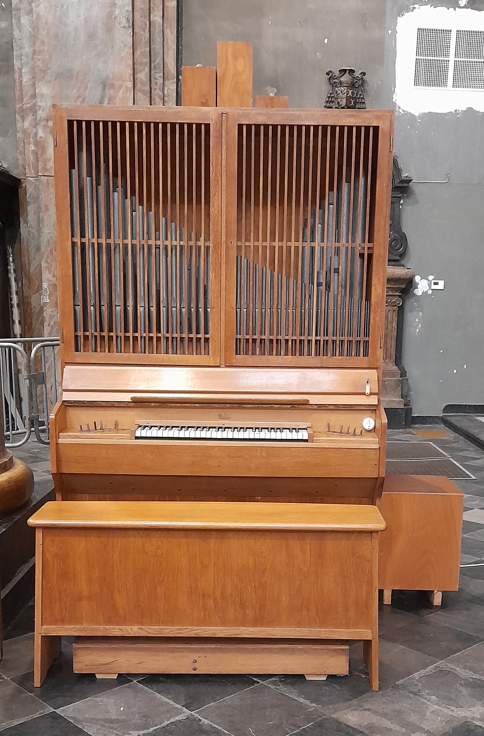 Cet instrument a été construit dans les années 60 par le facteur d’orgues allemand Oscar Walcker, de Ludwigsburg. Après avoir été démonté puis entreposé chez Ladach à Wuppertal, il a été remonté à Sainte-Catherine par la Manufacture Orgues De Facto en octobre 2023. Cet orgue comporte un clavier (situé en fenêtre) et un pédalier et est entièrement mécanique. Les jeux sont divisés en Basses et Dessus (coupure entre Si 2 et Do 3) pour multiplier les possibilités. L’instrument comprend de beaux jeux doux de flûtes, de même qu’un plenum bien fourni et un 2 pieds sous la forme d’une flûte (Sylvestre). La Soubasse de 16’, dont les tuyaux sont situés à l’arrière du buffet, est appelée par une pédale. Ce 16′ donne de l’assise à l’accompagnement et il s’en dégage une impression de grand orgue. Les tuyaux du clavier sont protégés par une grille en bois qui s’ouvre en deux parties.
